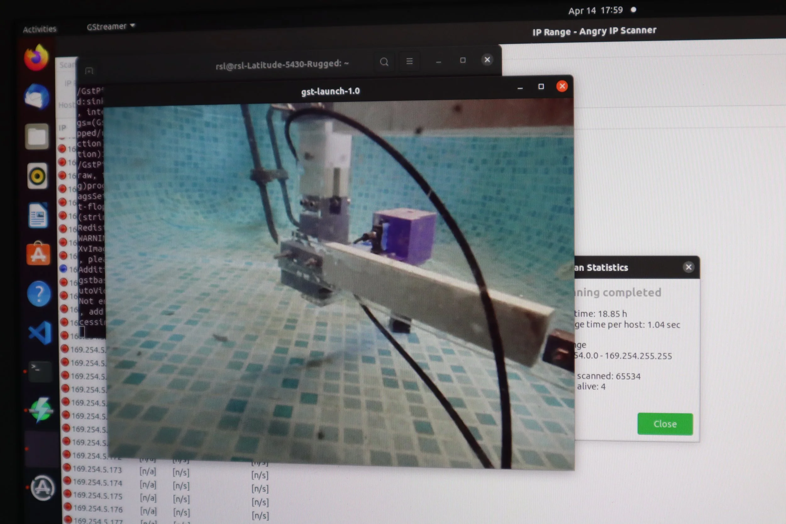 These two videos show the operation of the arm. It takes two people to operate the system. One person is the pilot (me), who controls the orientation of the ROV via its thrusters, and a second person who operates the arm. The video on the left shows what it looks like to the pilots of the ROV. As you can see, the on board camera quality is not great and future work consists of improving the camera quality and latency between the top side computer and the ROV.