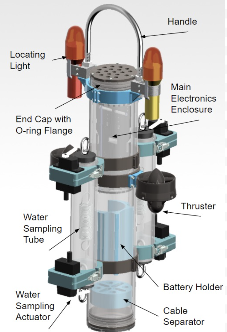 The Autonomous Underwater Vertical Project is a project that I worked on for 3 years in the Santa Clara University’s Robotic Systems Laboratory. Standard vertical profilers are often tethered devices that depend on either solar paneled buoys or ships of opportunity which lower the profiler down into a lake or ocean and collect data to categorize a column of water. Data collected usually includes pressure (which gives depth), temperature, salinity, turbidity, etc. The goal of this project was to create a tether-less, modular vertical sampler that could be used to take the basic sensor data of conventional vertical samplers while being comparatively low-cost and easy to use. The first prototype consisted of an acrylic tube to hold the electronics and utilized a rack and pinion drop weight system which would sink the profiler to a specified depth and then release the weight (a burlap sack of sand which would decompose in the ocean), allowing the profiler to float up to the surface. This design was then modified to use off the shelf underwater thrusters which would allow for multiple descents. The three pictures below show different iterations of the profiler—ranging from the drop weight system, to a single thruster, to a two thruster system. The bottom image and first video also shows a more recent addition: the water sample collection system I designed. This subsystem consists of a tube with two servos attached which seals at a certain depth specified and brings the water samples back up to the surface. This design was based off a Niskin bottle which is commonly used to collect underwater samples and ended up having a 95% collection success rate.